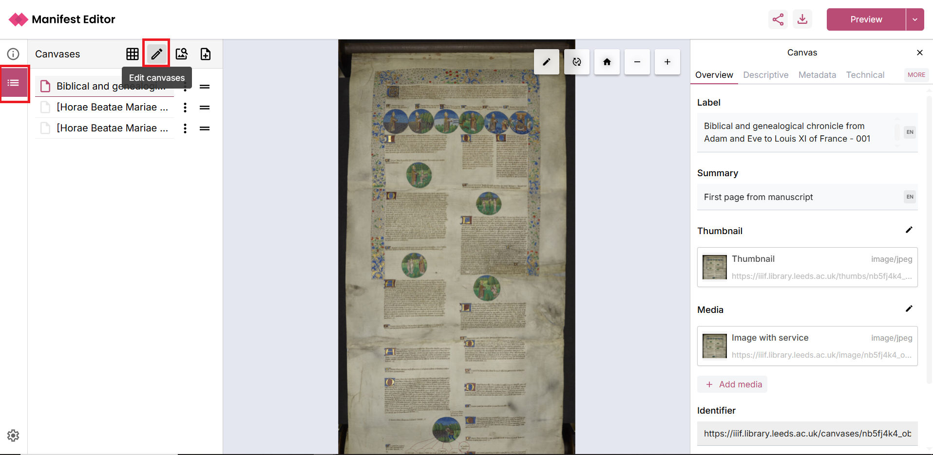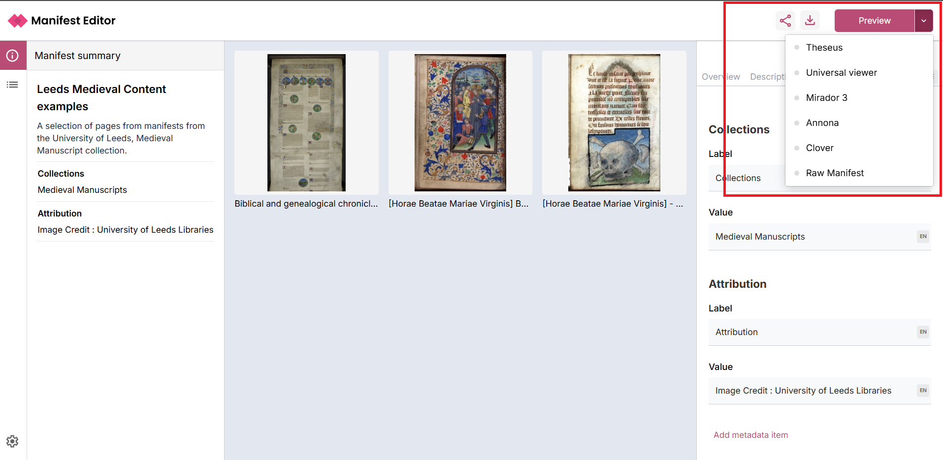 When you make changes, you can preview the changes in a number of viewers that are available within the Manifest Editor including Theseus, Universal Viewer, Mirador and others.