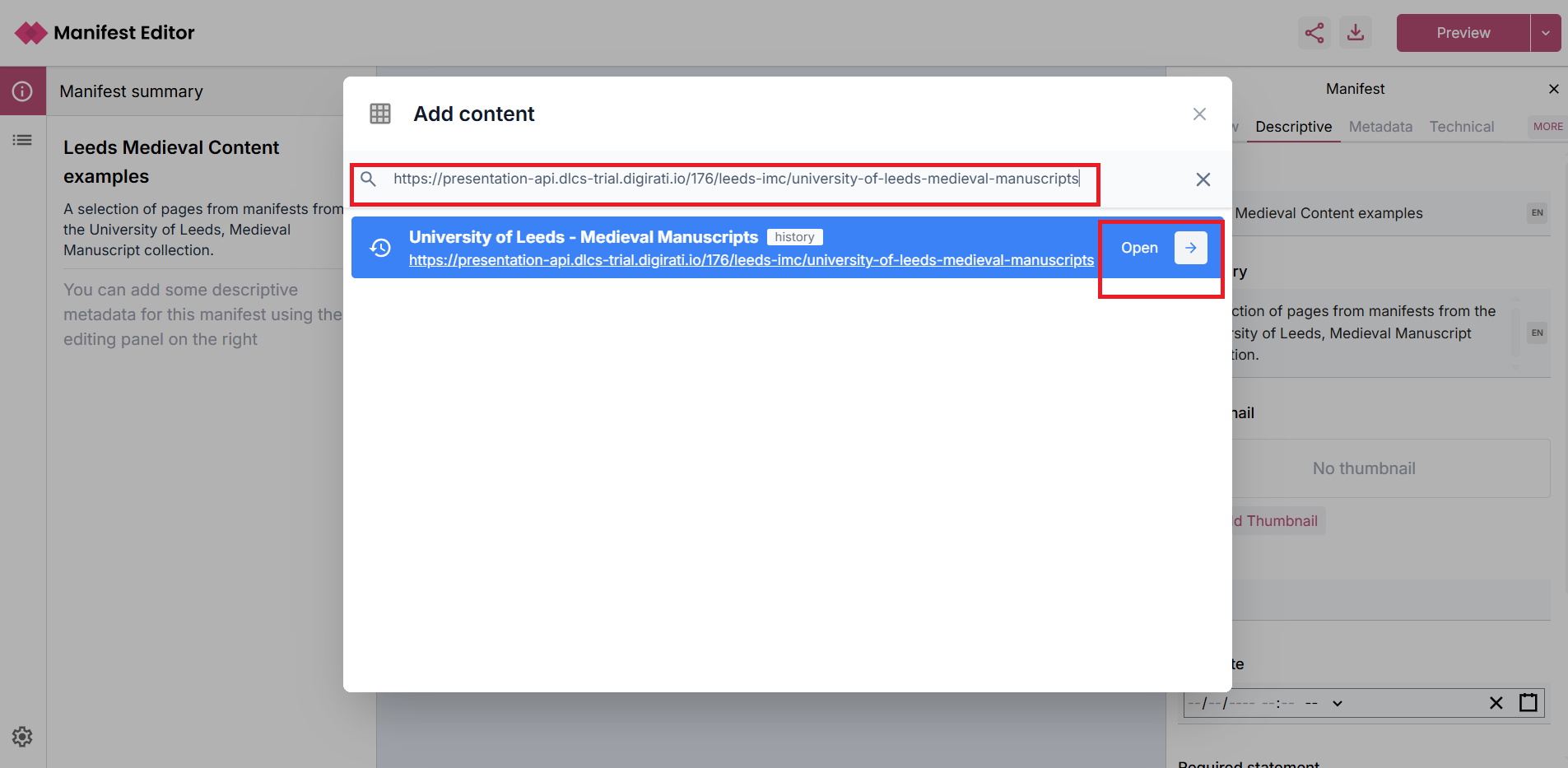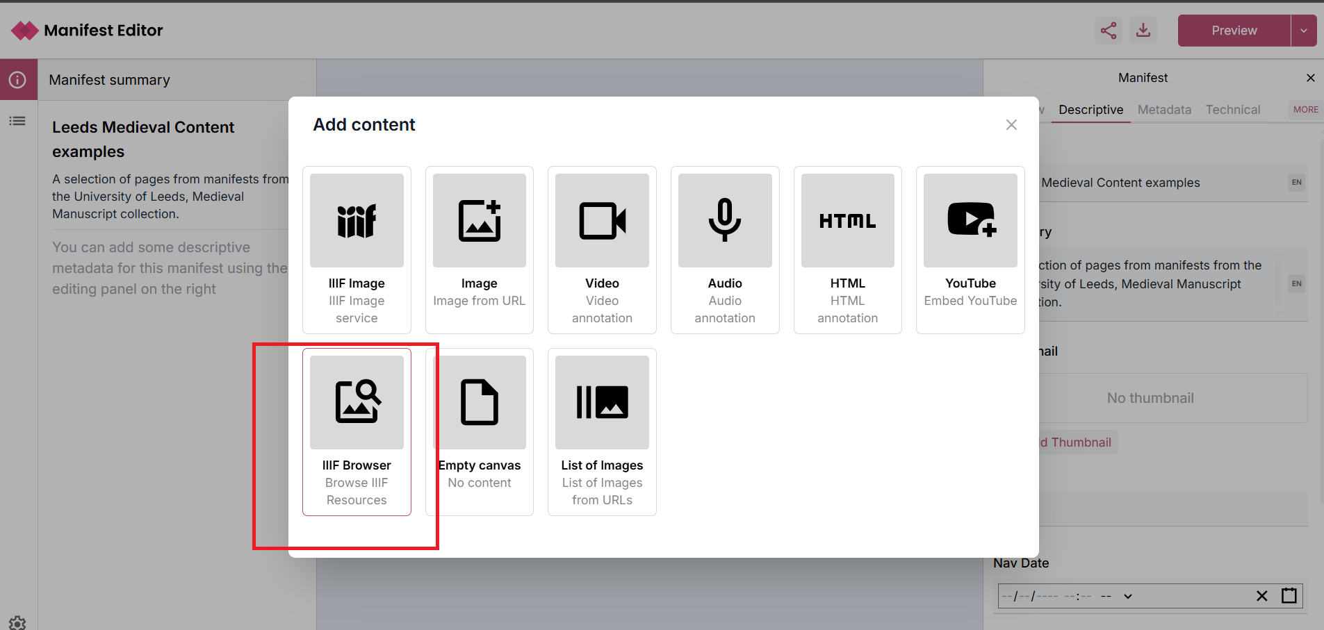 - Now you can select and find one or more IIIF content items to add to your Manifest