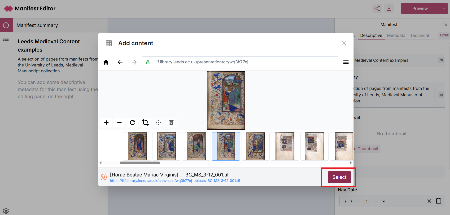 - Select a Manifest of interest, and then click on one of the Canvases within that Manifest. Using the Select option, you can add this content as a Canvas to your Manifest