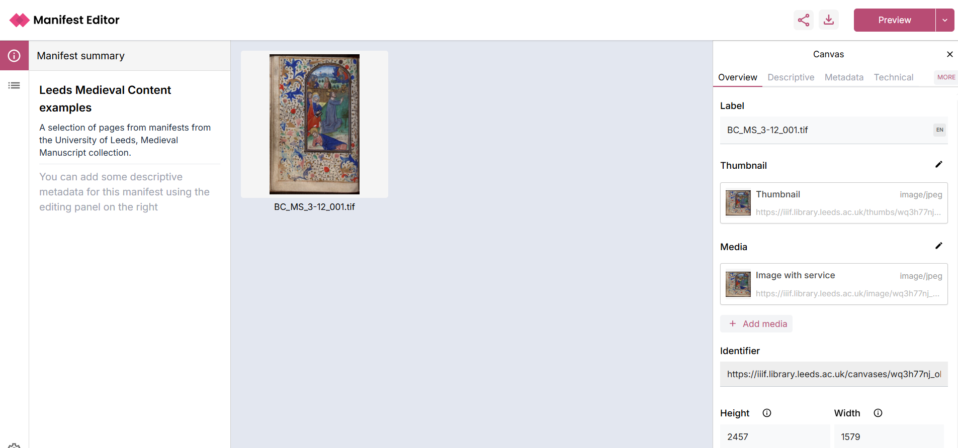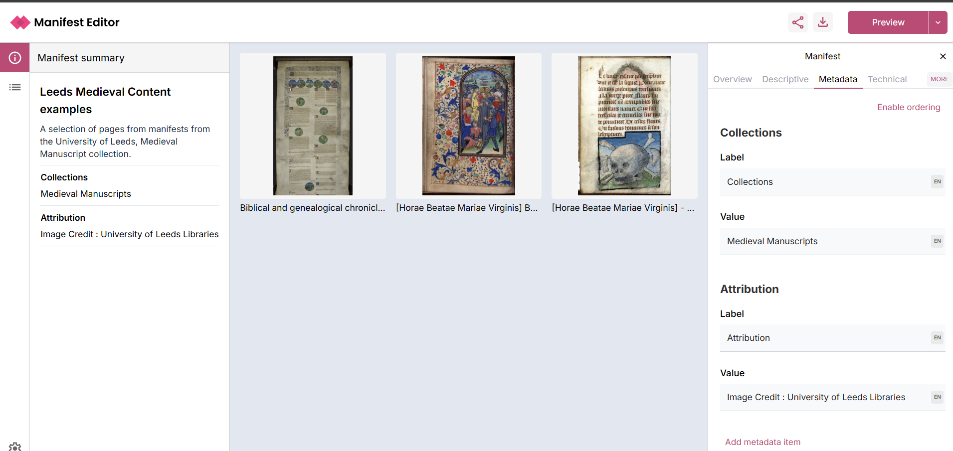 When you make changes, you can preview the changes in a number of viewers that are available within the Manifest Editor including Theseus, Universal Viewer, Mirador and others.