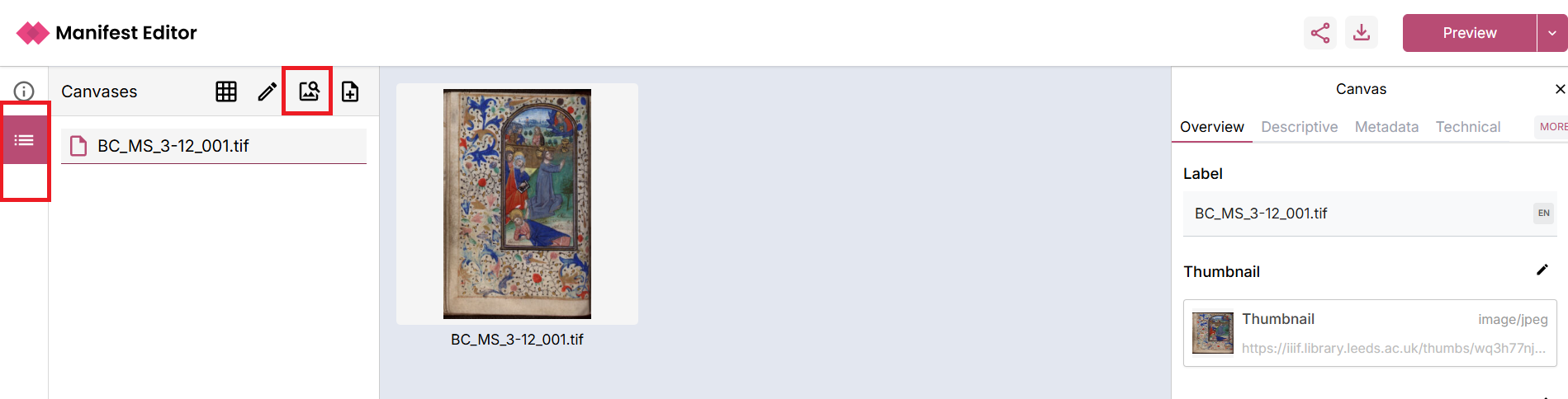 - You can continue to add more items to your Manifest, click on the Canvases link in left hand toolbar as indicated below. You can then use the IIIF Browser link to continue to select and add more content