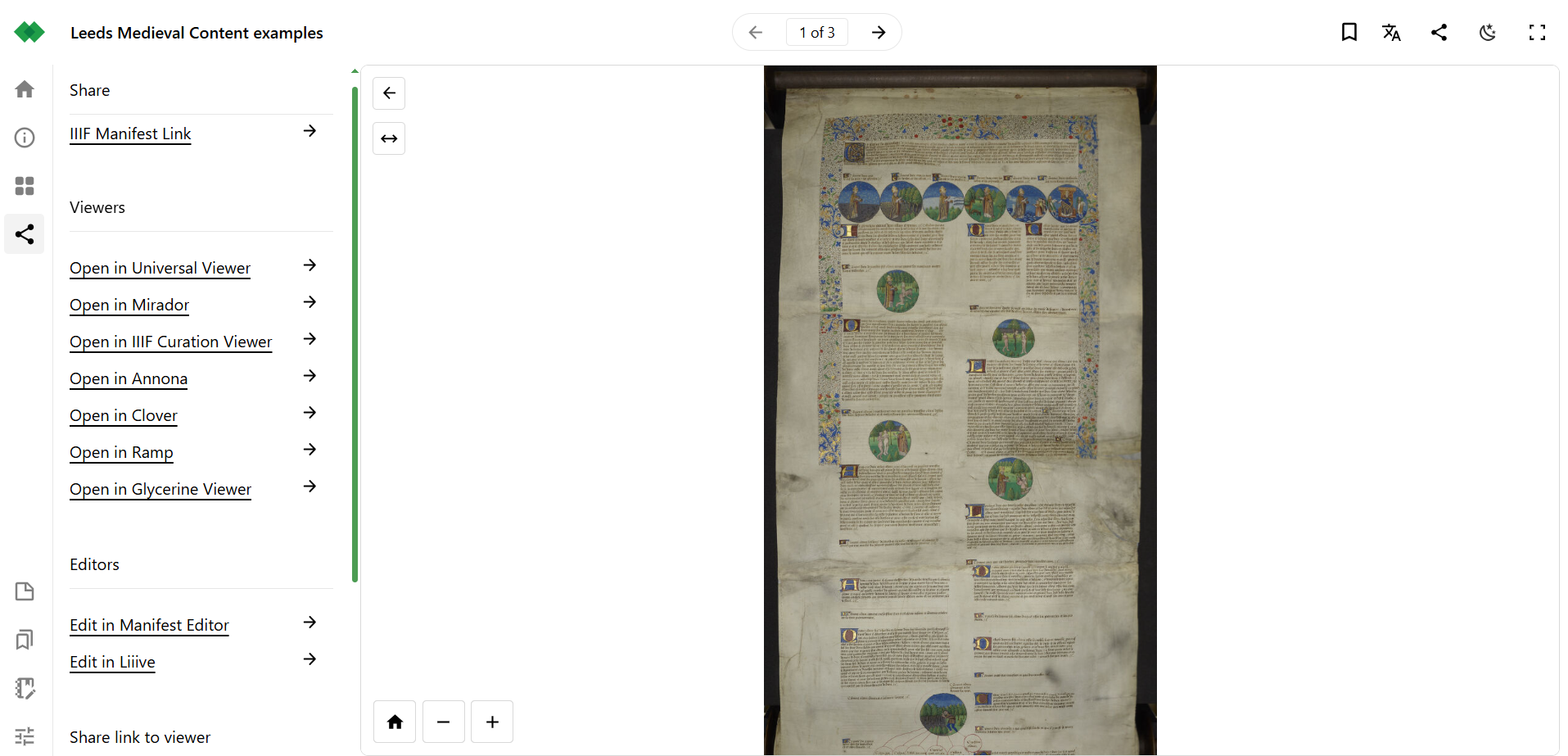 As a follow on activity, you can use the Theseus viewer's configured "Share" links to explore your Manifest in many other IIIF enabled viewers and some other editors. To do this, simply open your Manifest in the Theseus via the Preview option discussed in Step 5.
