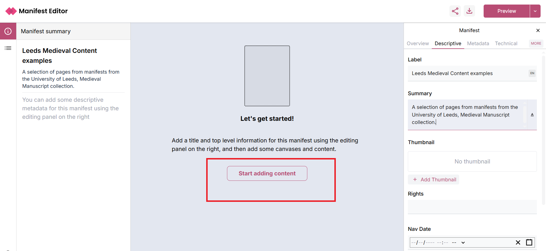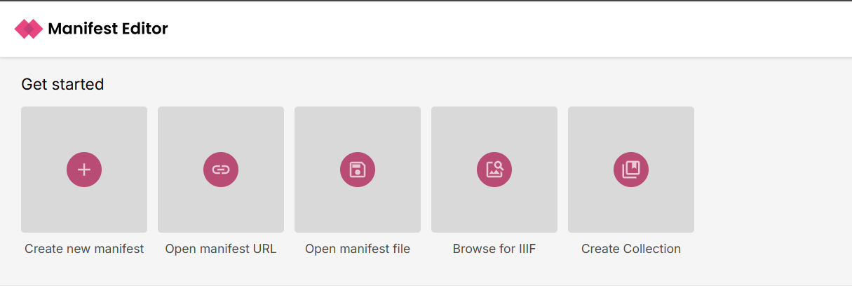 Using the 'Create new manifest' link on the Manifest Editor homepage will navigate you to an empty Manifest where you can begin to add your content.